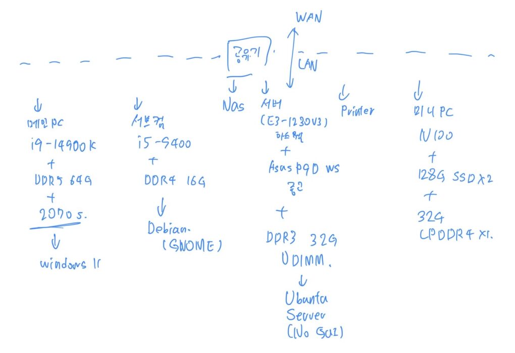 1. 장비자랑 제 홈 네트워크에는 아래 장비들이 붙어있습니다 *내부 서비스 장비> *컴퓨터> *기타 기기> 2. 기기별 IP 할당 3. 이해를 돕기 위해 녹화한 영상 4. 여담 다음에는 VPN세팅을 어떻게 했는지 아니면 자작서버는 어떻게 조립했는지 다루는 게 좋겠습니다